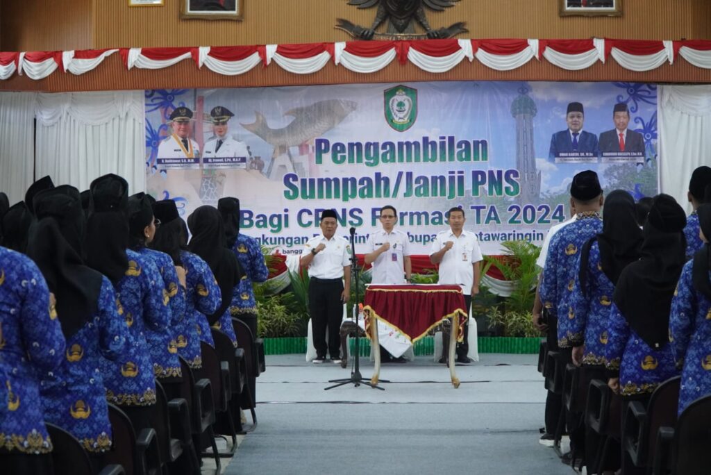 Pemerintah Kabupaten Kotawaringin Timur melaksanakan pengambilan sumpah/janji Pegawai Negeri Sipil (PNS) bagi CPNS Formasi Tahun Anggaran 2024 yang dirangkai dengan sosialisasi pencegahan HIV/AIDS di lingkungan pemerintah daerah.
