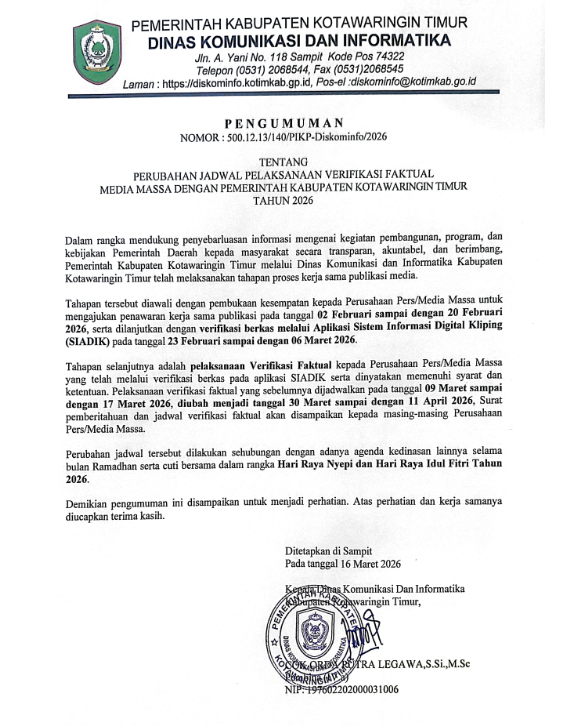Perubahan Jadwal Pelaksanaan Verifikasi Faktual Media Massa Dengan Pemerintah Kabupaten Kotawaringin Timur melalui Dinas Komunikasi dan Informatika Kabupaten Kotawaringin Timur Tahun 2026