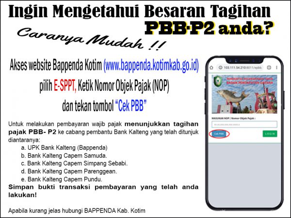 Cukup dengan akses website Bappenda www.bappenda.kotimkab.go.id dan buka pada menu aplikasi kemudian pilih E-SPPT, pada aplikasi tersebut anda tinggal memasukan nomor NOP (Nomor Objek Pajak) yg tertera di pojok kiri atas di lembar SPPT anda tahun sebelumnya, setelah itu tinggal klik ‘cek PBB’ dan jumlah tagihan PBB anda akan muncul, untuk melakukan pembayaran wajib pajak menunjukkan tagihan pajak PBB- P2 yang di dapat melalui aplikasi e-SPPT ke cabang pembantu Bank Kalteng yang telah ditunjuk diatas.